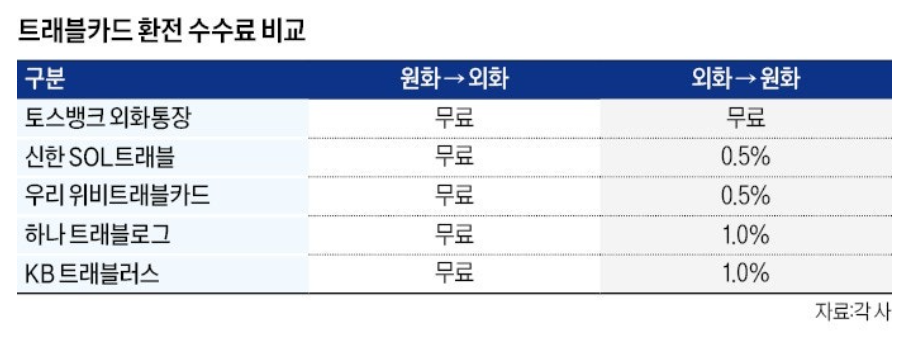 대부분 원화를 외화로 바꿀 때는 환전 수수료가 없지만 토스뱅크를 제외한 나머지 카드는 외화를 원화로 바꿀 때 재환전 수수료가 있습니다.